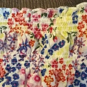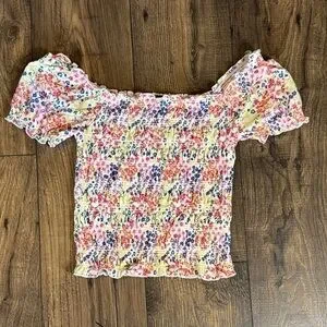 Vibrant floral blouse with smocked design. Off-shoulder style with short sleeves. Perfect for casual outings.