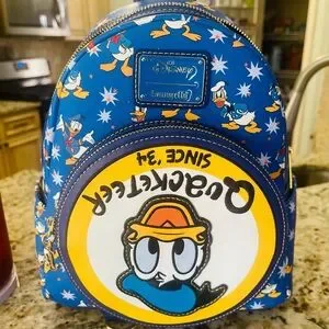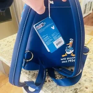 NWT Loungefly Mini Backpack Rare!!! Error Bag!! Image of duck on front upside down. Charming Loungefly backpack with Donald Duck design. Features playful blue and white colors. Ideal for kids.