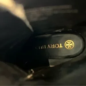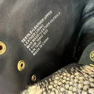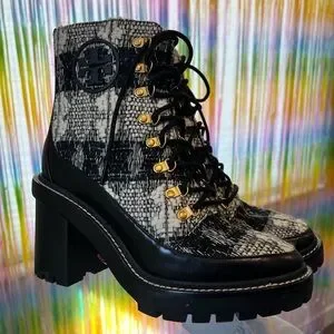Tory Burch tweed ankle boots with lace-up front and chunky block heel. Black leather trim and gold-tone hardware accent the tweed upper. Lug sole for added traction and stable wear.
