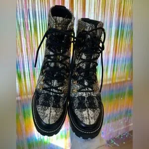 Tory Burch Black and Cream Tweed Lace-Up Block Heel Ankle Boots