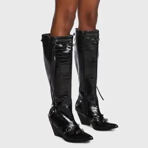 Sleek black croc-embossed, black high knee boots with a glossy finish.