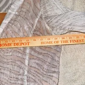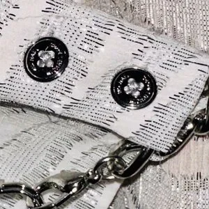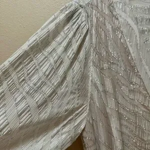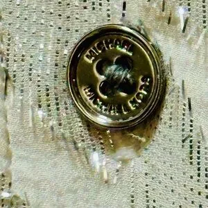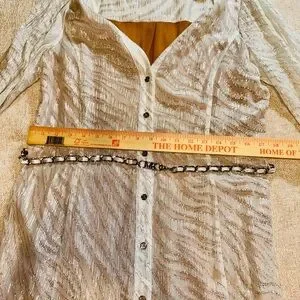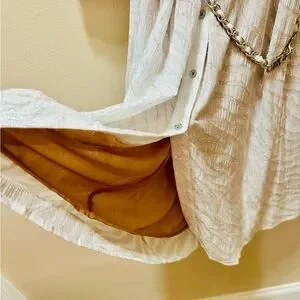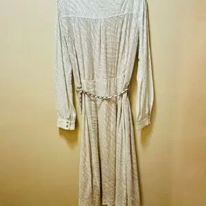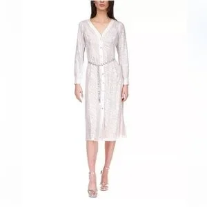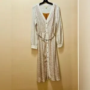 Michael Kors long sleeve maxi dress in cream and white. Button-front design with subtle metallic shimmer. Includes decorative chain belt at the waist. Flattering V-neck silhouette for versatile wear.