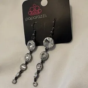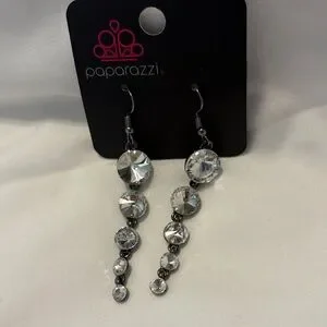 Paparazzi brand long dangle earrings with graduated clear rhinestones. Multi-tiered round crystals create a sparkling cascade. Elegant shimmer for dressy looks.