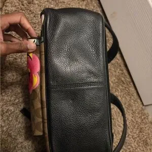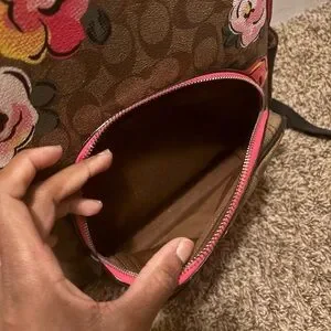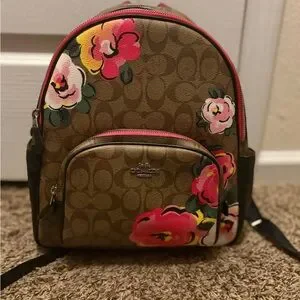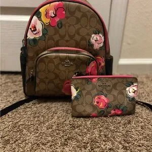 Coach mini backpack with matching wristlet. Signature coated canvas with floral print. Pink trim and floral accents. Silver hardware and Coach logo on both pieces. Stylish set for everyday use.