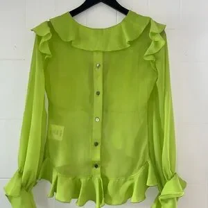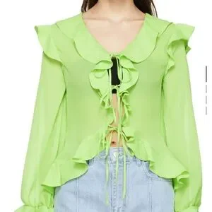 lime green blouse with feminine ruffle trim at neckline, cuffs, and hem. Lightweight, airy fabric for all-day comfort. Button-front design with long sleeves for versatile styling. Adds a fresh, vibrant pop of color to any outfit.