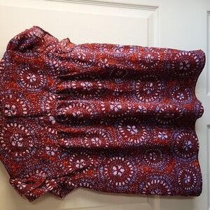 Short-sleeve blouse with ruffle trim at sleeves and neckline. Smocked yoke with gentle gathers for a breezy silhouette. All-over floral medallion print in contrasting accents. Easy pull-on design for everyday wear.