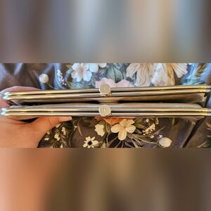 ☆ Simple and elegant gray HOBO-The Original Lauren clutch. Silver-tone metal frame and kiss-lock closure. Smooth faux leather exterior with subtle texture. Versatile neutral accessory for day or evening.