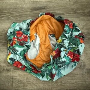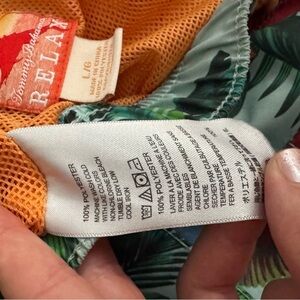 Size Large Dive into summer with these vibrant tropical floral swimsuit board shorts. Featuring a lively mix of red, green, and white, these shorts are perfect for beach days and pool parties. Elastic drawstring waist lined with orange mesh and has pockets