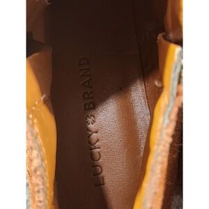 Label/Tag details: Interior size print reads 9.5M/39.5 and lists LEATHER UPPER, FABRIC MAN MADE LINING, MAN MADE SOLE, MADE IN CHINA, LK BASEL 5; Lucky Brand logo also appears on the insole, zipper pulls, and outsoles.