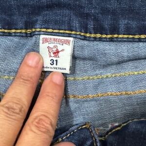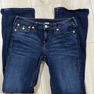 Authentic True Religion Joey bootcut jeans featuring signature horseshoe stitching and flap pockets.