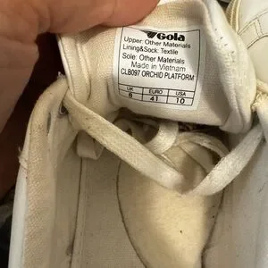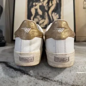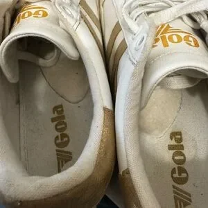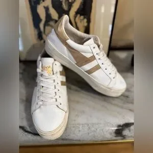 Classic Gola low-top sneakers. White leather upper with gold accents. Lace-up closure for a secure fit. Cushioned insole for comfort. Clean, versatile style for everyday wear.