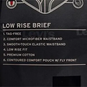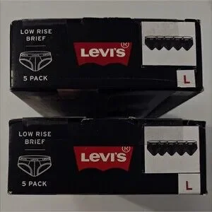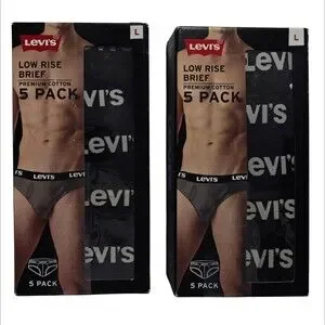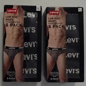 2 sets of 5 packs for a total of 10 pairs Mens new in package premium cotton low rise briefs from Levi's in men's size large. Please see closeups of size chart, recommended for 36" to 38" waist. Some imperfections to the packaging.