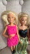 Set of three fashion dolls. One doll in a pink crochet outfit. Another in a green and black dress. The third in a red and pink dress with pink shoes. The two doll outfits on the outer sizes are handmade by mom’s crochet 🧶.
