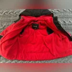 Boys hooded winter jacket in black with red accents. Water-resistant shell with warm red fleece lining. Secure zip closure and pockets. Comfortable fit designed for active outdoor play.