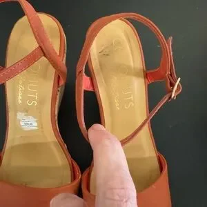 Vibrant orange wedges with a cork platform. Stylish and comfortable for any outing.