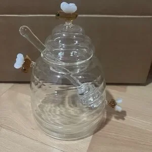 Clear glass honey jar with charming bee accents. Includes a glass dipper.