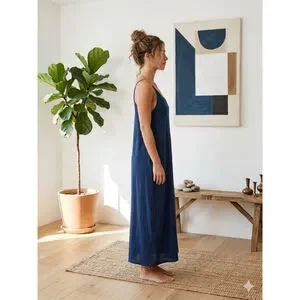 Embrace the elegance of the LOVESTITCH Navy Blue Maxi Dress. This piece captures a minimalist bohemian aesthetic, blending a relaxed, flowing silhouette with a deep navy hue. Crafted from lightweight, textured rayon gauze, it offers a beautiful drape that moves with you.