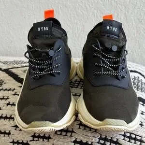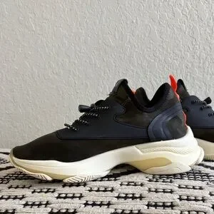 Bold sneakers with black upper and orange accents. Comfortable and stylish for everyday wear.