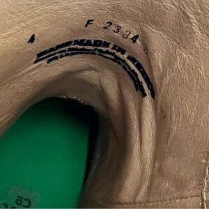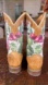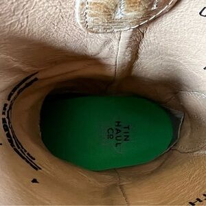 Tin Haul western boots in tan leather. Bright floral pattern also has green insole with brand logo. Traditional cowboy styling and stitched details. So cute and stylish. Size 4 in children’s I wear a 7 adults and can get my foot into them. So if your foot is on the smaller side you can wear these as an adult . Very light ware , inside looks new . Super good shape.