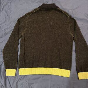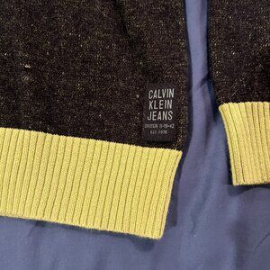 A sharp and stylish quarter-zip sweater from Calvin Klein Jeans with a great two-tone colorway. Dark olive/brown marled knit body with contrasting yellow ribbed trim at the collar, cuffs, and hem โ a classic CK detail that elevates the look. Perfect for layering in fall and winter!