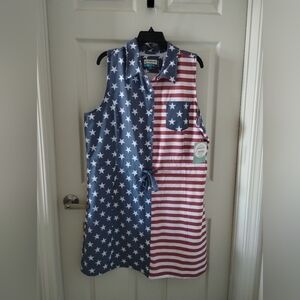 Sleeveless fish gear dress with American flag star and stripe print. Drawstring waist for adjustable fit. Front chest pocket detail.