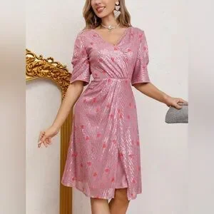 Valentine’s dress, heart dress, sequin dress, pink dress, sparkly dress, date night outfit, party dress, romantic style, girly dress, holiday outfit, V‑neck dress, short sleeve dress, glitter dress, cute dress, festive dress, sweetheart style, Galentine’s outfit, feminine fashion