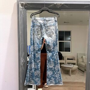 The light wash denim serves as a perfect canvas for a vibrant all-over floral print that brings a touch of romance and flair to your look. A distressed knee adds a touch of edgy cool, while the flattering flare silhouette elongates your legs for a statuesque silhouette. Imagine twirling through a summer festival or enjoying a casual brunch with friends in these uniquely styled jeans.