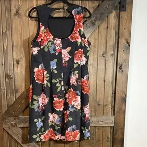 Elegant sleeveless dress featuring a vibrant floral pattern. Perfect for any occasion with its striking black and red design.