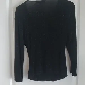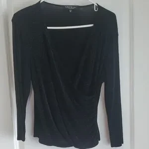 Elegant black top with shimmering details. Features a draped neckline. Perfect for a night out.