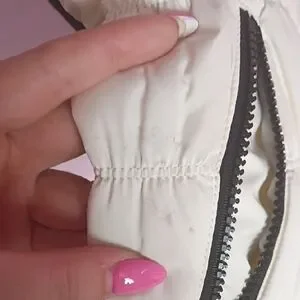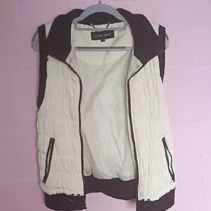 Stylish vest with a quilted cream front and black accents. Features a zip closure and side pockets. Perfect for layering.