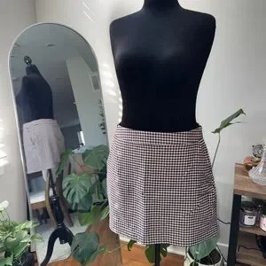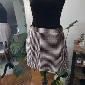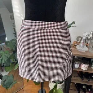 About: maroon white and black gingham mini skirt with black shorts, functioning pockets and a side zipper