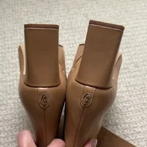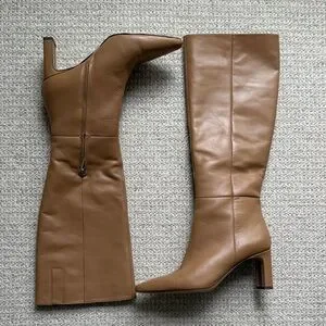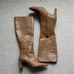 Chic tan heeled boots. In nearly new condition. Worn twice. Tiny bit of light scuffing to the back on one heel. Definitely not noticeable.