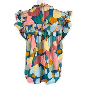 THML Abstract Geometric Flutter Sleeve Smocked Top Pom Pom Trim SRT1522-2-BL M