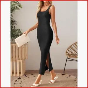 Sleeveless Square Neck Bodycon Midi Dress Side Slit Knit Casual