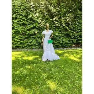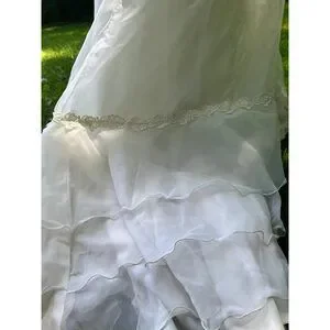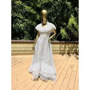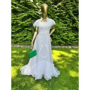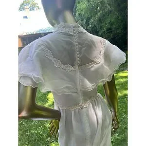 Light and airy vintage 70’s wedding dress with train. Ruffled with subtle lace design on the front—this dress is like twirling on a cloud. Charming southern belle vibes. Full description, details, and measurements coming soon, but mannequin is a size 4. Expect some signs of wear, as this dress is approximately 50 years old and is pre-worn. However, it was boxed and stored, and has no odors or damage. Professional cleaning is recommended.