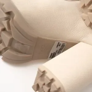 Brand new in box. Box is slightly beat up. Boots are in fantastic condition. The bottoms are clean. I don't see any surface scratches, dents, scuffs or stains. Slight folding by back heel which tells me they may have been tried on.