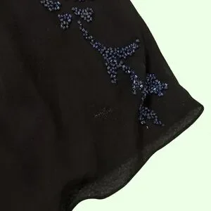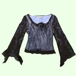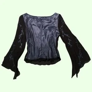 Elegant blouse with intricate floral design. Features flowing sleeves and a stylish neckline. Ideal for evening wear. Loved but taken care of, sold as is.