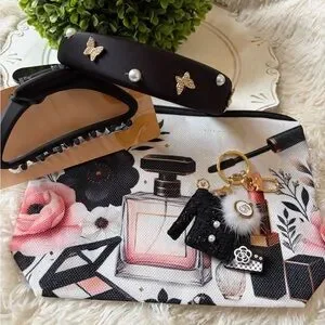 Accessory bundle- embellished hair accessories and makeup bag and purse charm