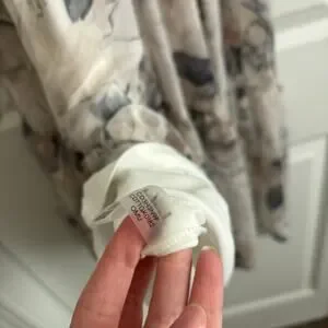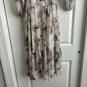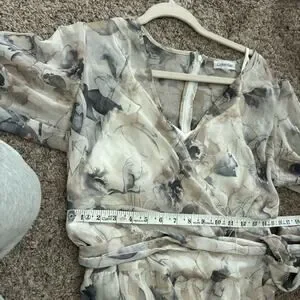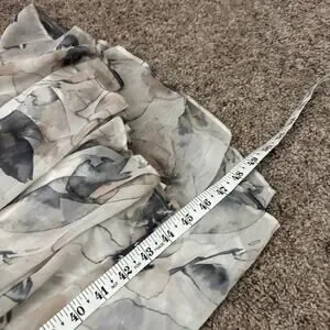 • Pattern: Sophisticated abstract floral print in muted earthy tones (grey, taupe, and cream).