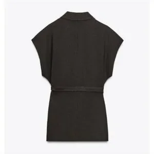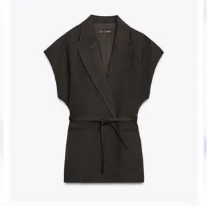 Vest made with 64% linen and 36% viscose fabric. V-neck wrap neckline and short sleeves. Adjustable tied self belt. Tonal interior lining. Front double breasted. Lining 100% cotton.