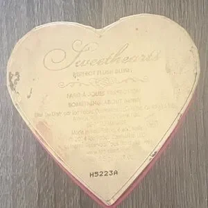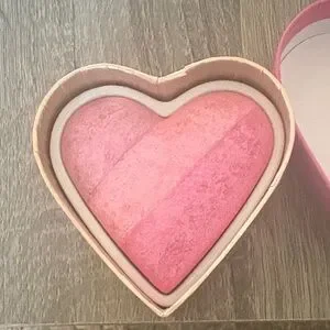 Heart-shaped Too Faced blush vibrant pink with gold decorative accents and logo. Elegant ornate design on the lid. Compact collectible piece for a vanity display. Discontinued and hard to find, the container on the back is a little dusty from being in my make up case.