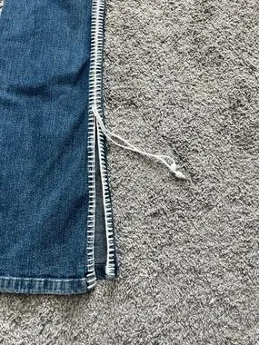 Stylish dark blue flared jeans with decorative white lace-up side trim. The lace-up waist and side detailing add a trendy, feminine touch. Comfortable stretch denim designed for everyday wear. Please review measurements as no size was included.
