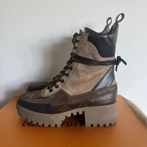 Authentic Louis Vuitton Suede Calfskin Monogram Laureate Platform Desert Boots size 37.5. Monogram toe trim and tongue, brown suede, and leather laces.