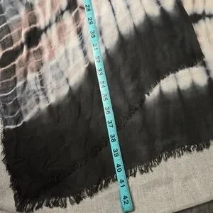 Tie-dye kimono beach coverup with raw hem and a flowing silhouette. It has a waterfall hem in front as well as slits on each side. Features a striking black and white pattern with a pinkish hue included on the bottom portion of the kimono.