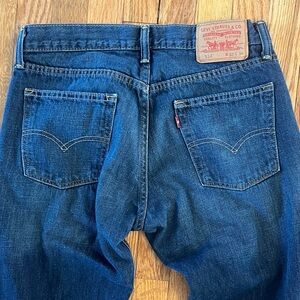 Levi's straight-leg jeans in a deep blue wash. Classic five-pocket styling with visible back pocket stitching. Leather brand patch at the waistband. Durable denim with clean, timeless look.