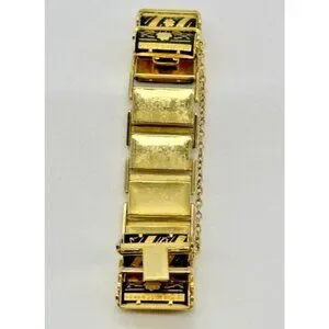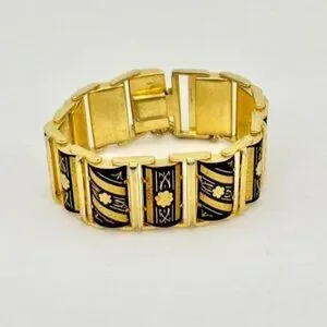Beautiful vintage damascene bracelet is made of connected gold-tone links that have been enameled in black, with beautifully etched floral and scrolling motifs. The bracelet closes with a very secure box clasp, and has an attached safety chain for extra security. The bracelet measures 7-1/2 inches long and is in very good condition. Unmarked.