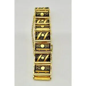 Vintage Damascene Links Bracelet Gold-Tone Metal with Etched Black Floral Motif~