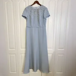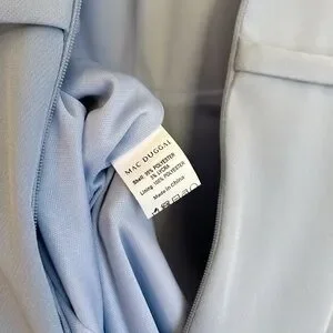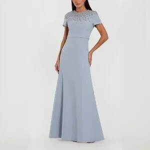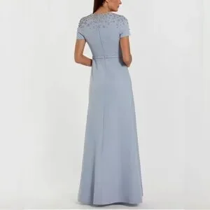 Elegant MAC DUGGAL powder blue gown with rhinestone embellished upper bodice and upper back. Fitted waist with attached thin waistband, and flowing A-line skirt. Short sleeves for a refined look. Subtle sparkle adds elegant detail. Exquisite choice for any formal occasion, galas, mother-of-the-bride/groom. Very recently purchased. Extra rhinestones included. Kept hanging and covered.