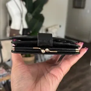 Black. Water buffalo cafeskin leather. Hidden snap closure. Eight credit card and two multipurpose pockets. I.D window. Two bill compartments. Kisslock coin purse. Brass hardware. 4x4