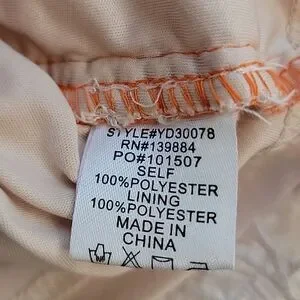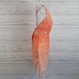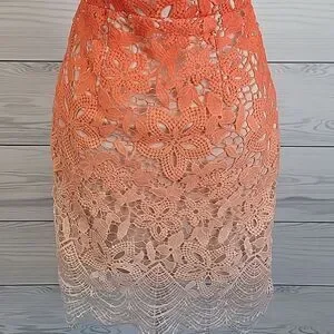 A lovely ombre of orange colors this halter dress by A. Peach with a high neckline and strappy back, form fitting waistline, and a beautiful crocheted lace overlay. Great pre-owned condition with normal signs of wash and wear.